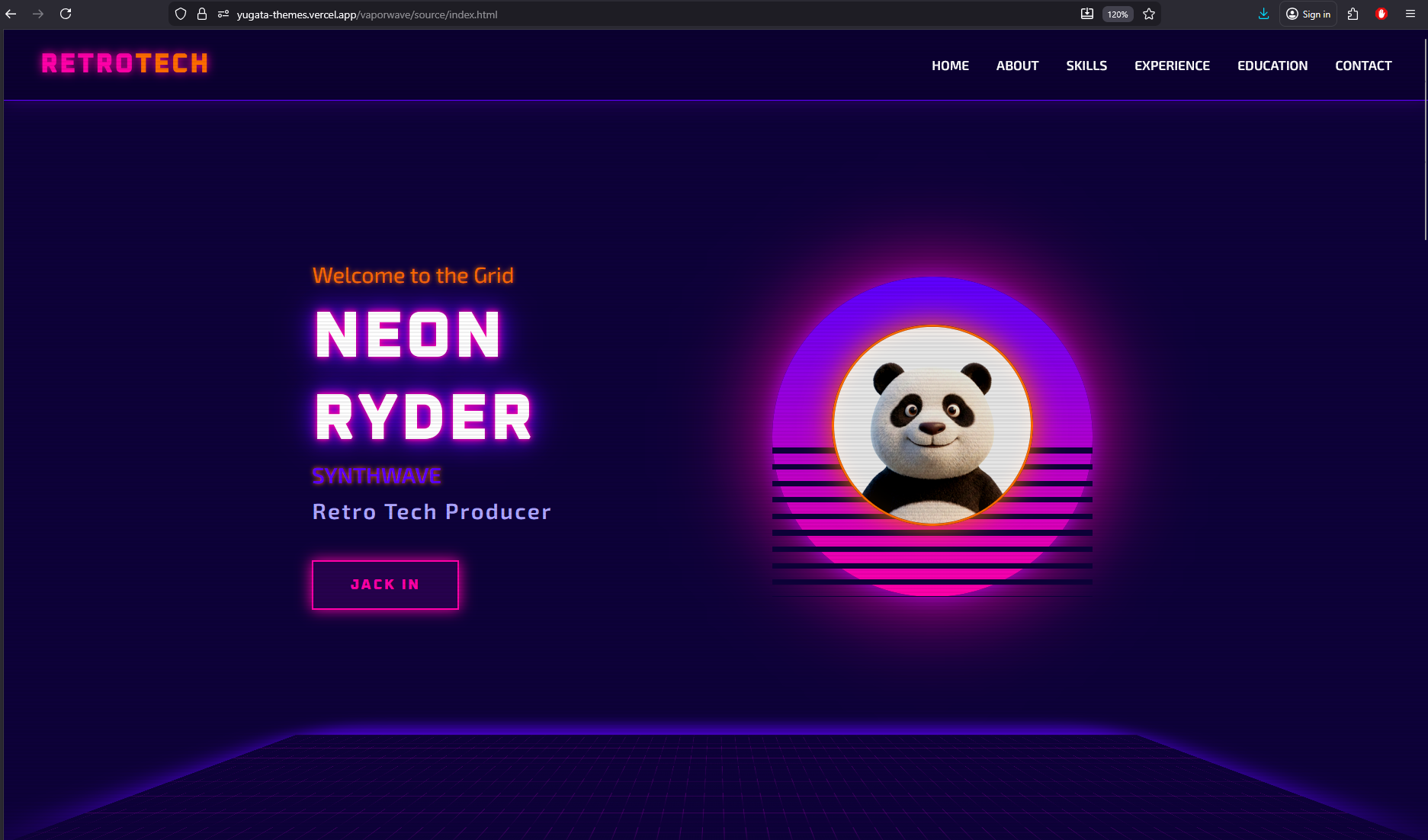 Synthwave 80s UI with neon gradients, grid floors, and retro-futuristic vibes.